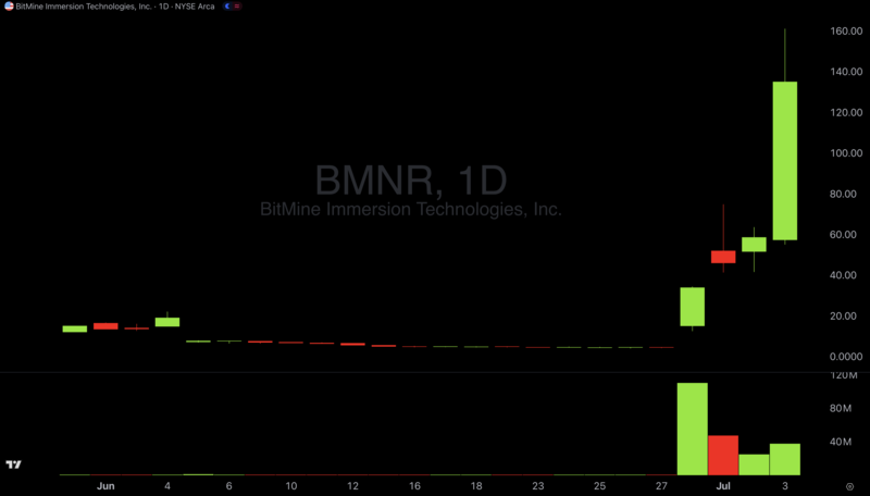 BitMine, which previously had a modest $26 million market cap and declining stock, is now up nearly 3,000% on the week and has a market capitalization of roughly $800 million.