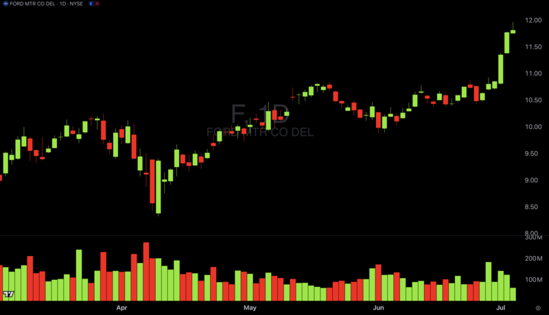 F up 10% this week after the company reported its June total vehicle sales numbers.