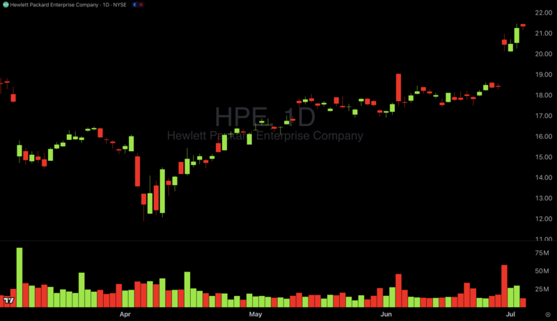 HPE up 15% this week after the company and Juniper Networks reached an agreement with the US DOJ to resolve its lawsuit challenging HPEs acquisition of Juniper, clearing the way for the deal to close.