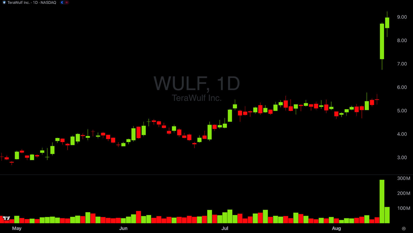 TeraWulf (WULF) shares surged after announcing two 10-year high-performance computing hosting agreements with AI cloud platform Fluidstack, valued at about $3.7 billion, with potential to reach $8.7 billion through extensions.