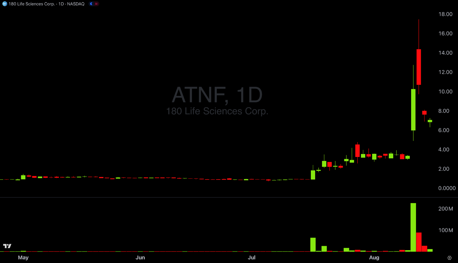 ATNF up 133% this week on recent news of the company’s ETH treasury strategy.