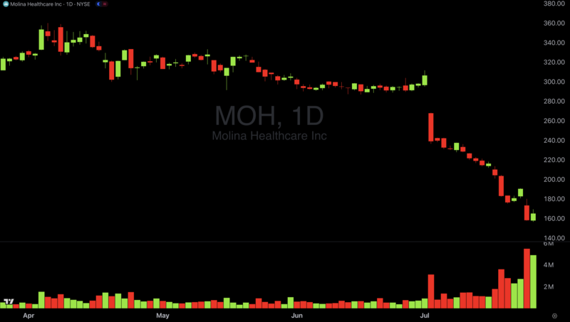 MOH down 20% this week amid mixed Q2 results and soft forward guidance.