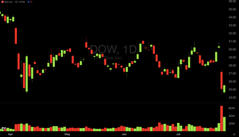 DOW down 12% this week after the company reported worse-than-expected Q2 financial results and cut its dividend by 50%.