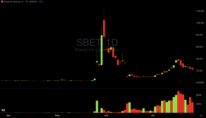 SBET down 35% this week on continued selling pressure after announcing a filing to sell up to $5B in stock.